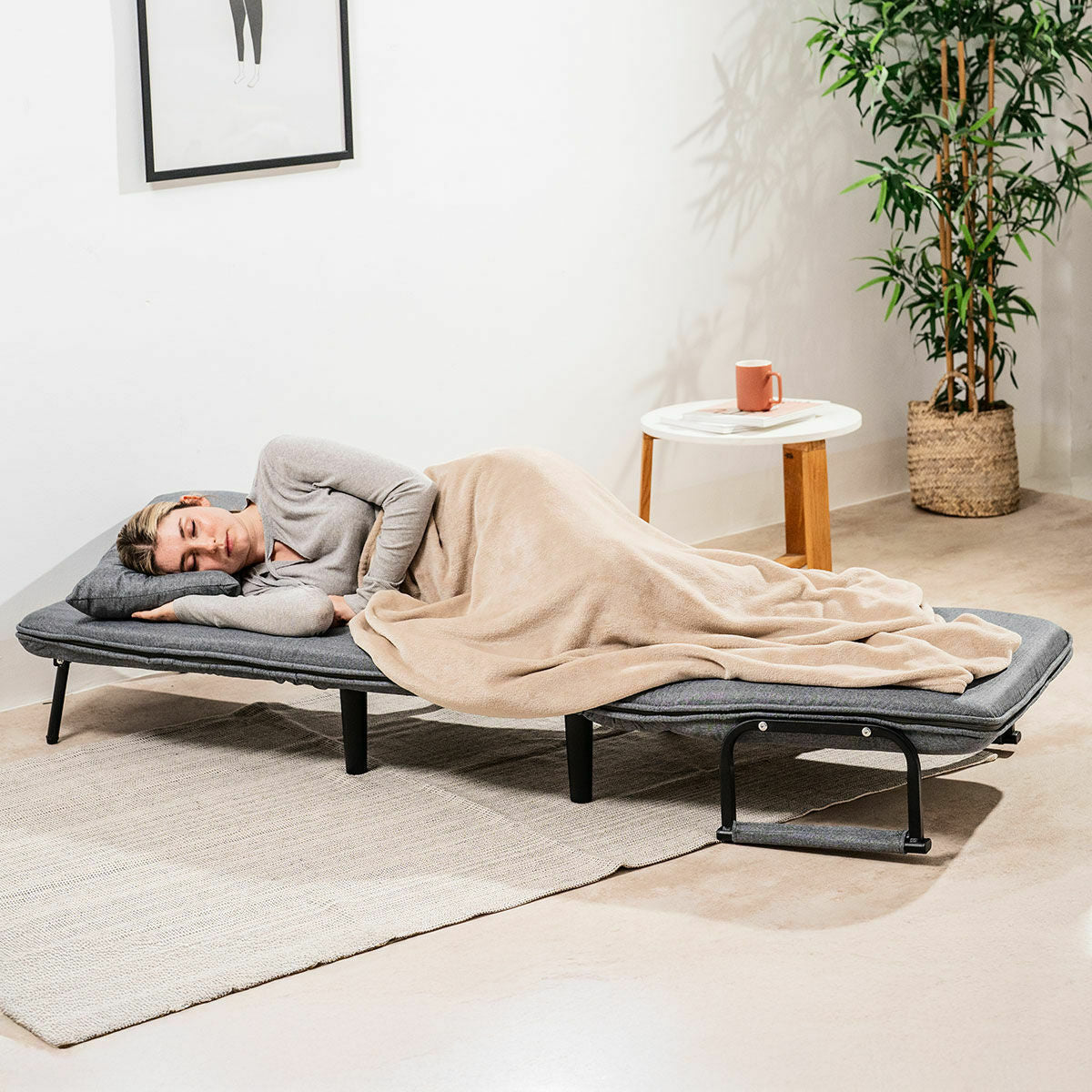 - Moderni ja ergonominen design: tämä 4-in-1 muunneltava yhden hengen vuodesohva sopii erinomaisesti mukavaan rentoutumiseen ja nukkumiseen. Innovatiivisen jatkettavan ja taitettavan designin ansiosta se mukautuu eri käyttötarkoituksiin ja vie vain vähän tilaa. Valmistettu laadukkaista materiaaleista: polyesteripäällys, vaahtomuovitäyte, rakenne terästä, rautaa ja polypropeenia (PP).