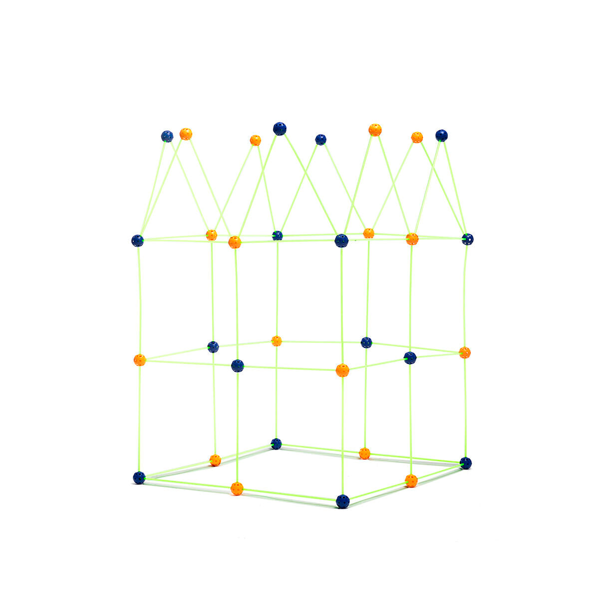 - Monia erilaisia rakenteita: lasten linnoituksen rakennussetillämme voi rakentaa erilaisia rakennuksia liittämällä pallot ja tangot yhteen: iglut, talot, avaruusalukset, teltat, tiipiit jne. Lisäksi suojakankaan voi laittaa rakennuksen päälle sen viimeistelemiseksi ja sisätilan suojaksi.