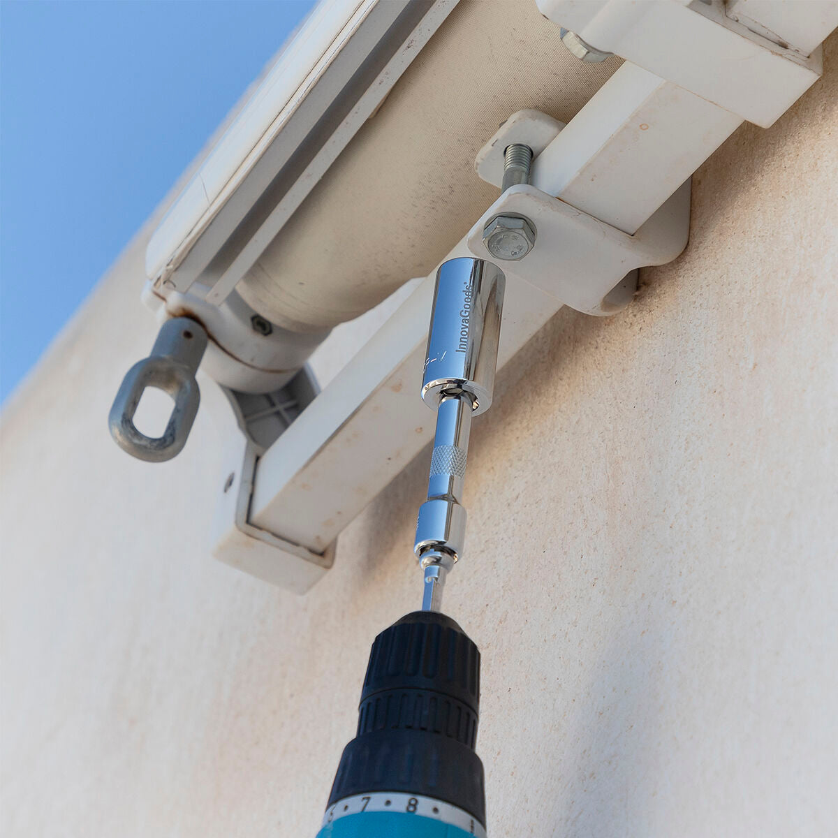 Innovatiivinen ja monipuolinen yleishylsyavain lisäosilla, jonka avulla voit ruuvata kiinni ja irti kaikenlaisia muttereita, ruuveja, koukkuja, kulmanauloja jne. Sopii 7-19 mm:n ruuveille ja se sopii kooltaan mihin tahansa kokoon ja muotoon. Tuotteeseen sisältyvän yleisliittimen ansiosta yleishylsyavain asettuu helposti räikkäavaimeen, poraan tai sähköiseen tai käsikäyttöiseen ruuvimeisseliin, joissa on vaihdettavat ruuvinkannat. Tuotteeseen sisältyvät jatkoliittimet ulottuvuuden pidentämiseksi ja 150°:n kulma-avainliitin vaikeapääsyisiin paikkoihin tai alueille, joissa on vain rajoitetusti tilaa. Yleishylsyavain on valmistettu korkealaatuisista ja kestävistä metalleista, ja sitä on erittäin helppo käyttää, kuljettaa mukana ja säilyttää. Tämän alkuperäisen, käytännöllisen, kompaktin ja kevyen työkalun ansiosta sinun ei tarvitse kantaa raskaita työkalupakkeja tai laatikoita, joissa on monia erikokoisia hylsyavaimia erilaisille ruuveille.